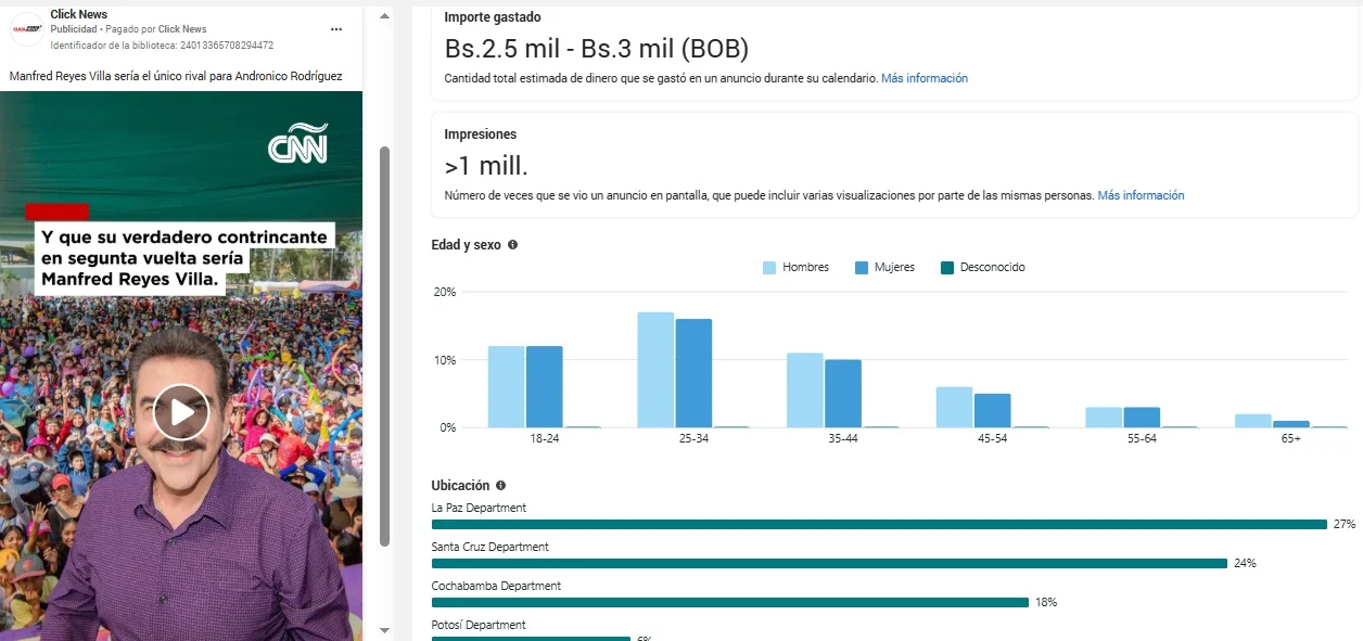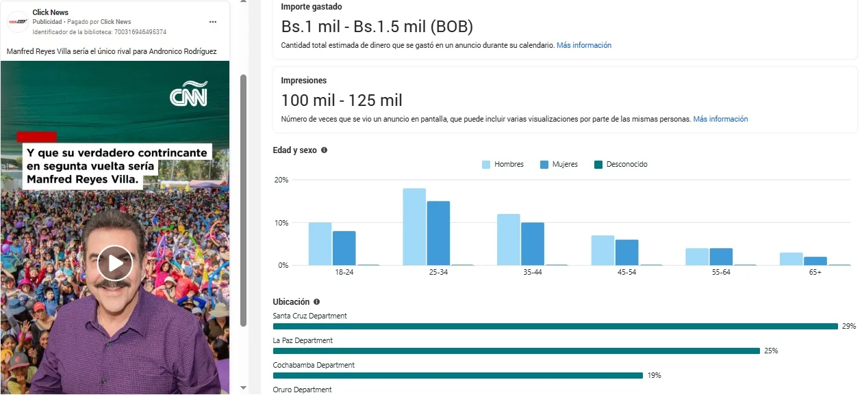 Los desinformantes usan las páginas Click News y Bolivia News para promocionar videos falsos. Las cuentas se administran desde México y Bolivia y en varios casos difunden contenido favorable a Manfred Reyes Villa.