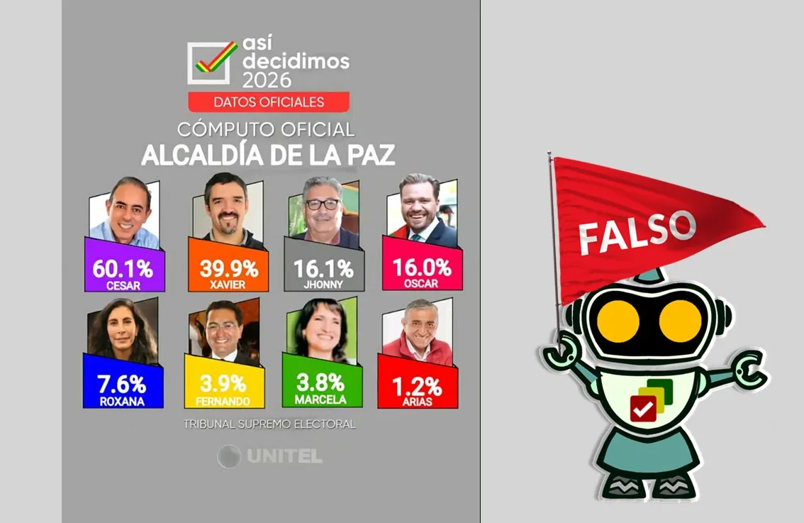 Por la cuenta de TikTok @BoliviaestaconTuto se compartió los resultados «de un cómputo oficial» de la Alcaldía de La Paz. En el mismo se ve a varias figuras políticas de la sede de Gobierno, como concejales y el actual burgomaestre Iván Arias, entre otros. No obstante, este contenido es falso porque Unitel no publicó este contenido y aún no existe el calendario oficial ni candidaturas habilitadas para las elecciones subnacionales 2026.