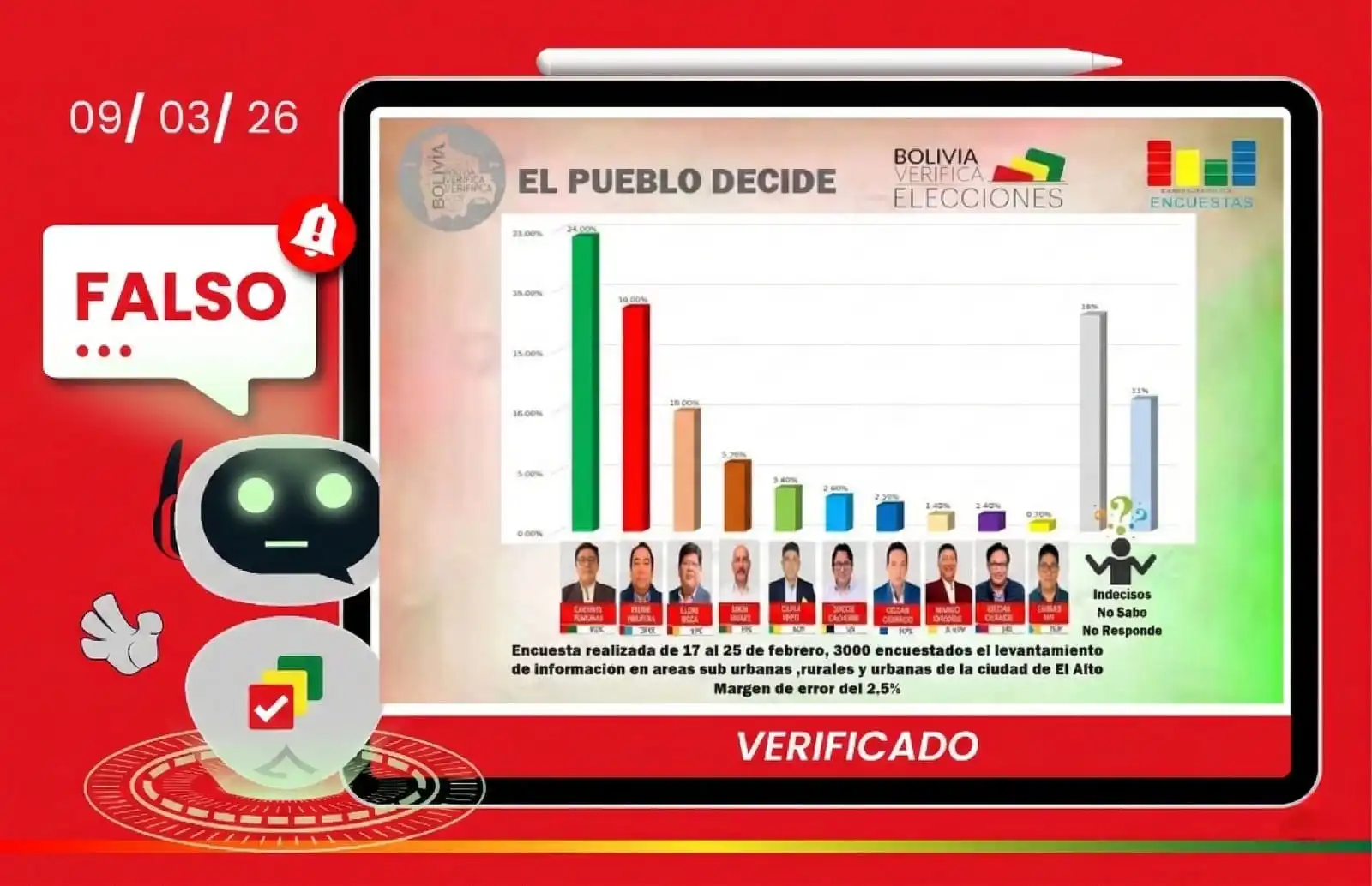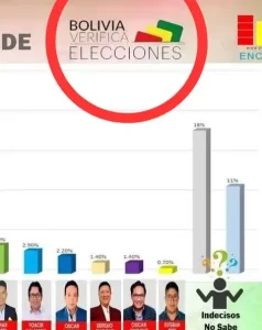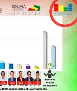 Por otra parte, el logotipo de la empresa encuestadora que aparece en la publicación corresponde a una página de encuestas de Peru Encuestas.com.pe, que no guarda relación con el proceso electoral boliviano.