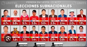 Además, solo muestra 10 candidatos y dos categorías adicionales, cuando oficialmente son 18 los postulantes habilitados para el municipio de El Alto y, hasta el momento, la única encuesta difundida que cumple con los requisitos establecidos para su publicación es la realizada por IPSOS-Ciesmori para Unitel.