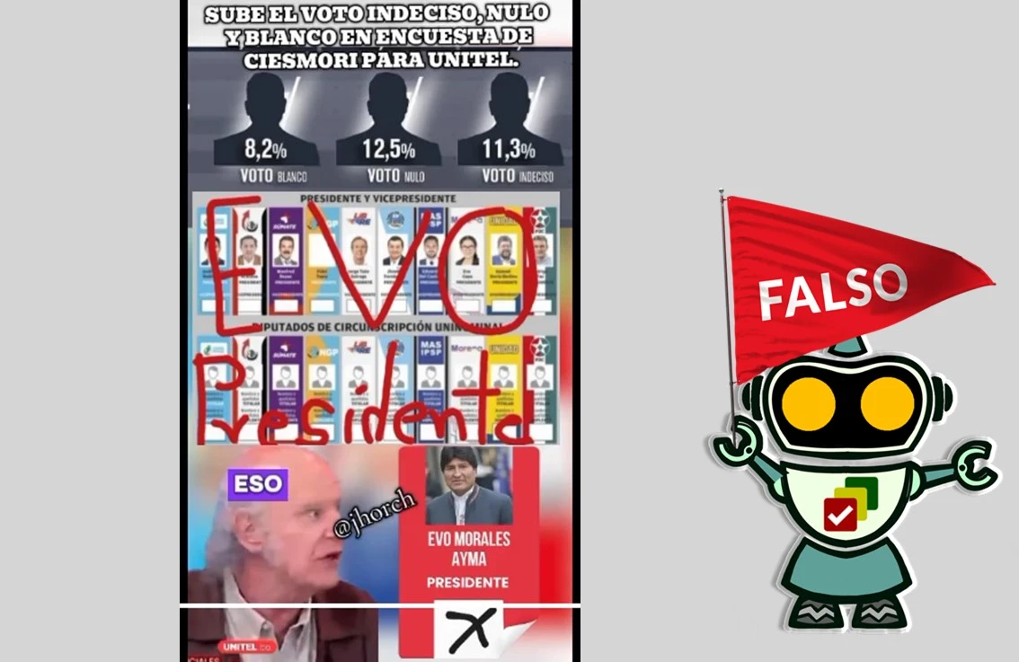 Para crear este bulo, los desinformantes tomaron extractos de los análisis que el periodista hizo en el programa «Así Decidimos» de Unitel, durante la presentación de la segunda encuesta nacional de intención de voto.