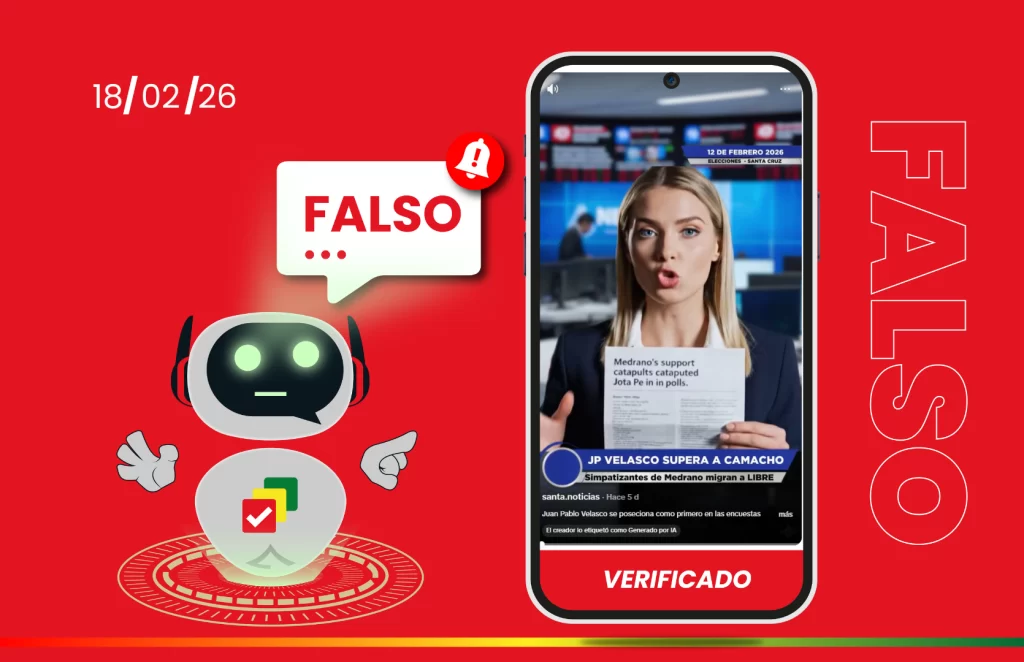 El contenido, difundido en Tik Tok, no corresponde a una encuesta oficial ni fue elaborado por una empresa habilitada por el Órgano Electoral Plurinacional (OEP).ContentsAnálisis del videoAnálisis técnico con herramientas de detecciónNo cumple requisitos de una encuesta electoral válidaContexto de encuestas oficiales Es falso el video que circula en Tik Tok y que asegura que … Sigue leyendo Video generado con IA simula encuesta electoral y atribuye un 41% de apoyo a Velasco tras su alianza con Medrano
